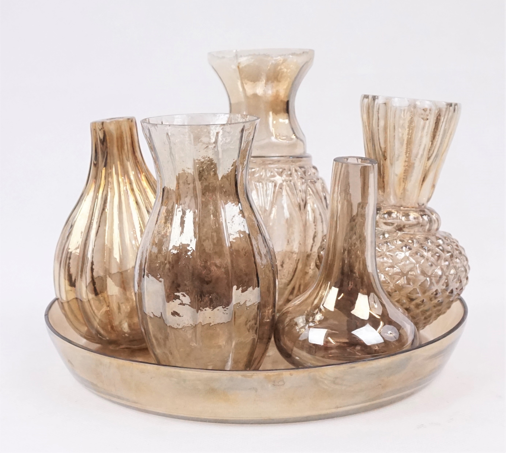 Discover the stylish "Poesie" S/6 vase ensemble - an exquisite addition to your shop in the home and lifestyle sector. This 6-piece ensemble, presented on an elegant, round tray in rich brown, is the ideal eye-catcher and adds a stylish accent to any presentation. The harmonious combination of different vase shapes and sizes allows you to create versatile floral arrangements that will impress in both modern and classic interior design settings.