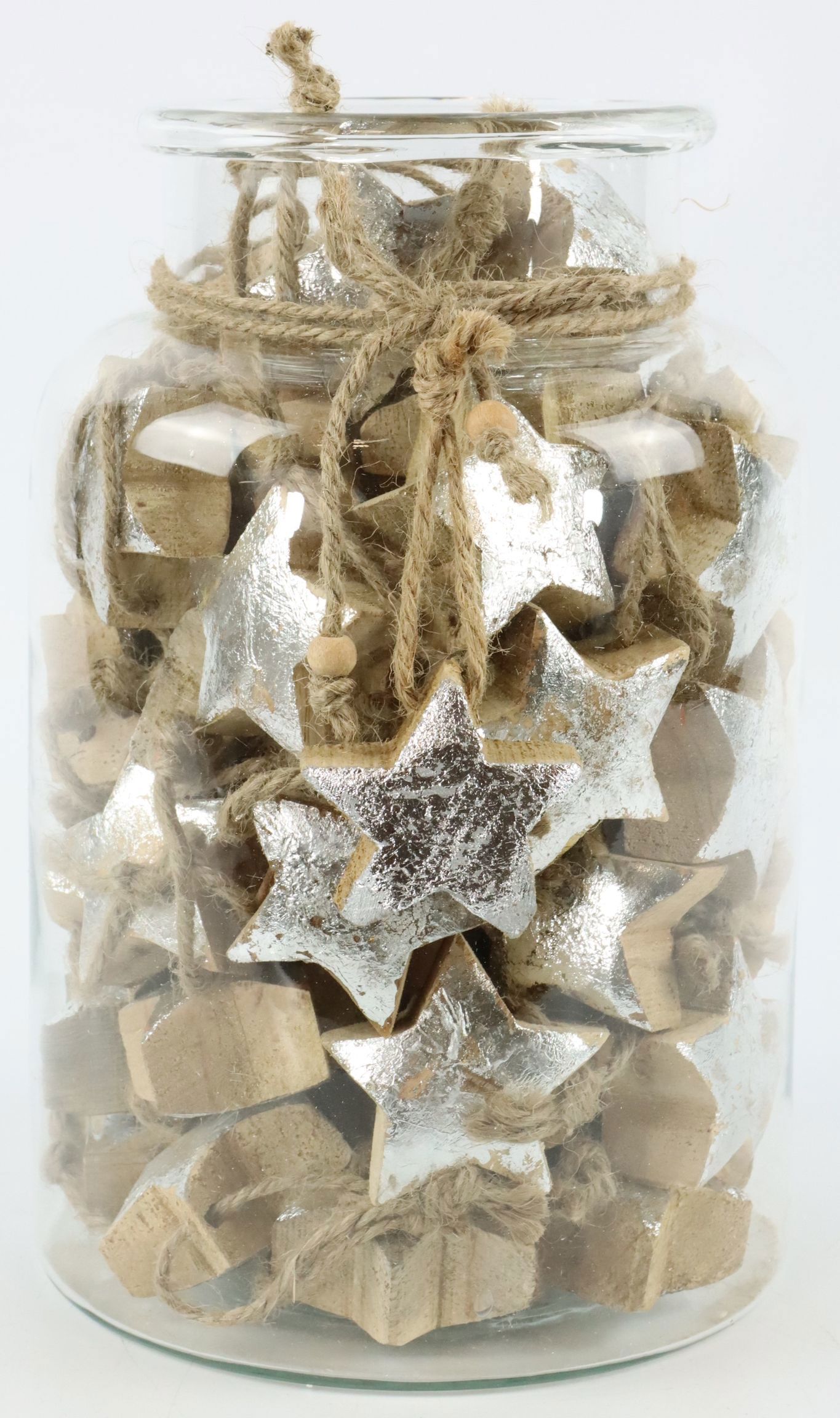 The set consists of 61 silver-coloured stars, which are made of high-quality mango wood and are approximately 5 cm tall. The stars come in an attractive glass jar, which is approximately 26 cm high and serves as the perfect display case for these delicate beauties. Each star is carefully crafted to ensure elegance and excellence. They are sturdy enough to last several seasons, but also lightweight enough to be hung on Christmas trees, wreaths, windows and other decorative surfaces.