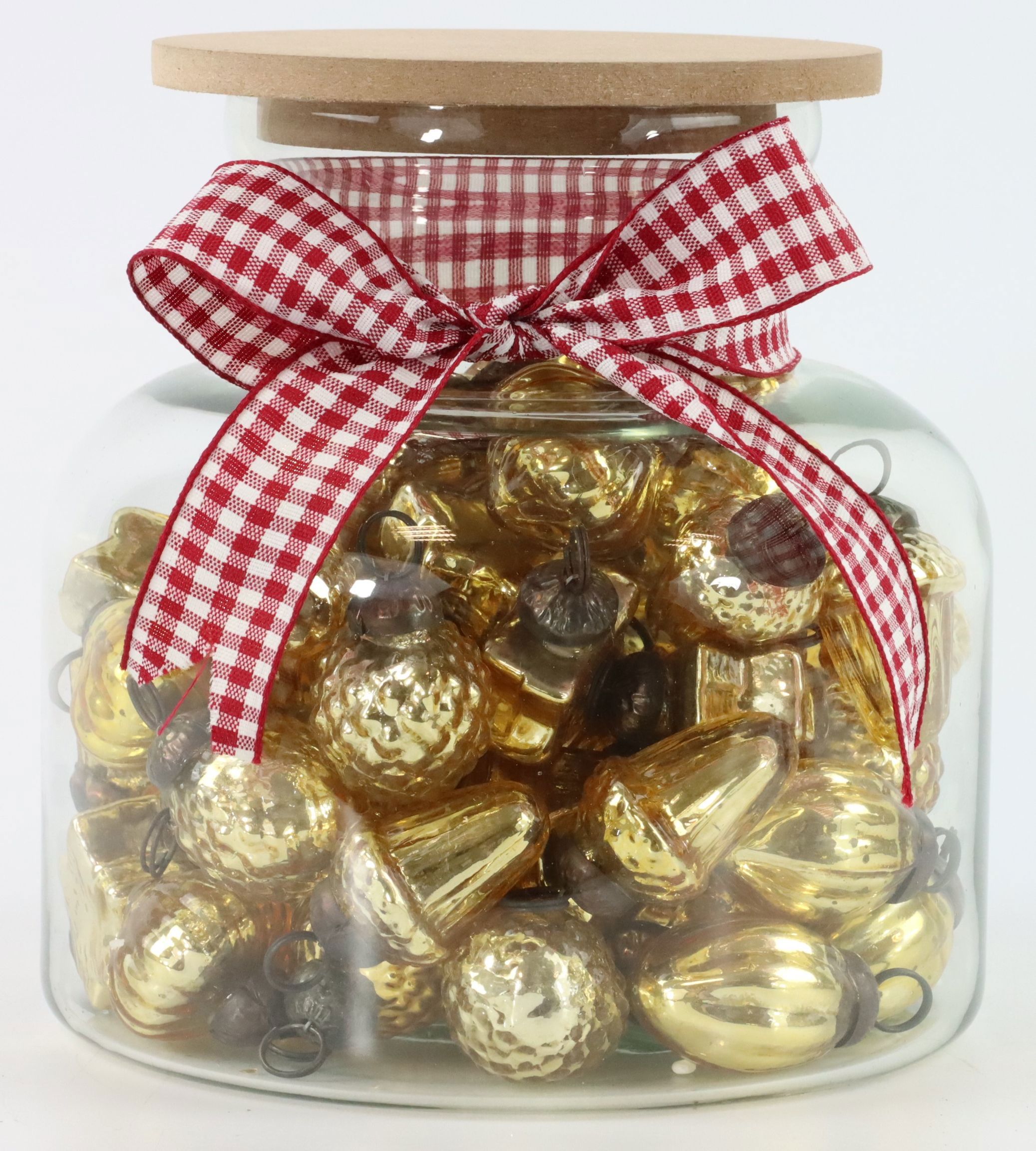 The set is presented in a high-quality glass vase measuring approximately 17 cm and topped with a robust wooden lid. This brilliant presentation not only emphasises the luxe touch of the golden Christmas baubles, but also makes them a fascinating gift option for your customers to give to their loved ones.