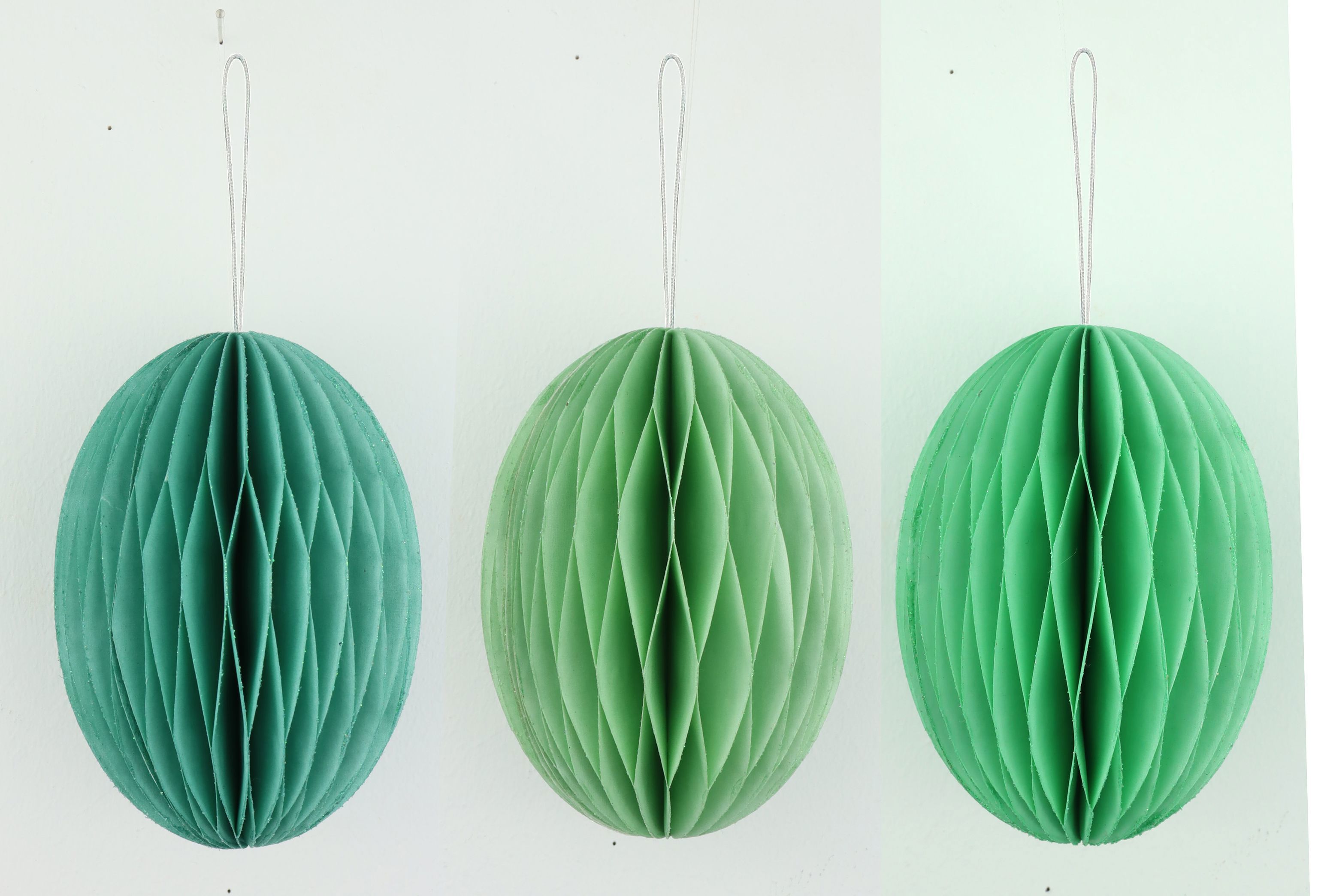 Discover the enchanting "HONEYCOMB" hanging decoration set for the Easter season - a perfect addition to your shop range in the home and lifestyle sector. Our three-piece set consists of skilfully crafted hanging eggs in a cheerful shade of green. Each egg is made from high-quality paper and measures approximately 12 cm, making it the ideal size for an attractive window display or stylish interior decoration.