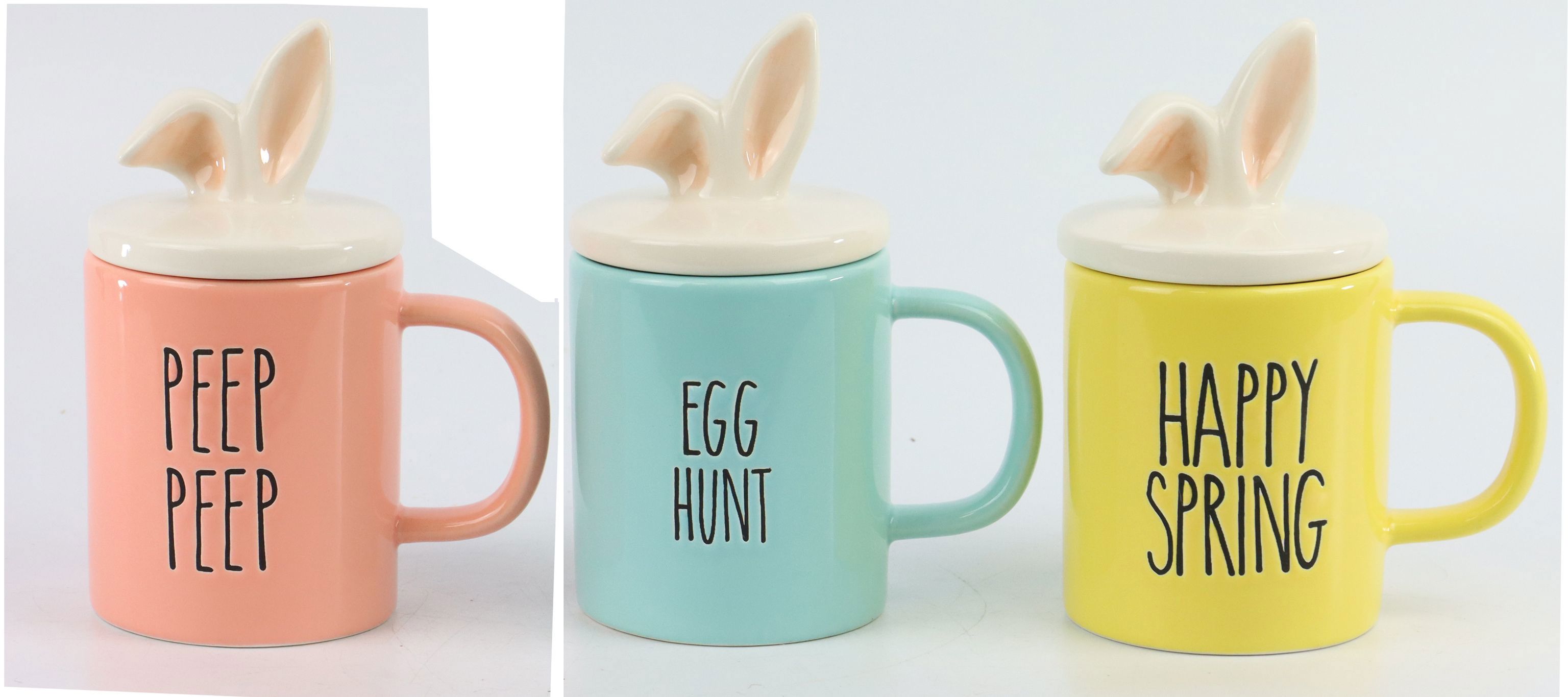 - Three high-quality ceramic mugs with lids in "Candy Easter" design
