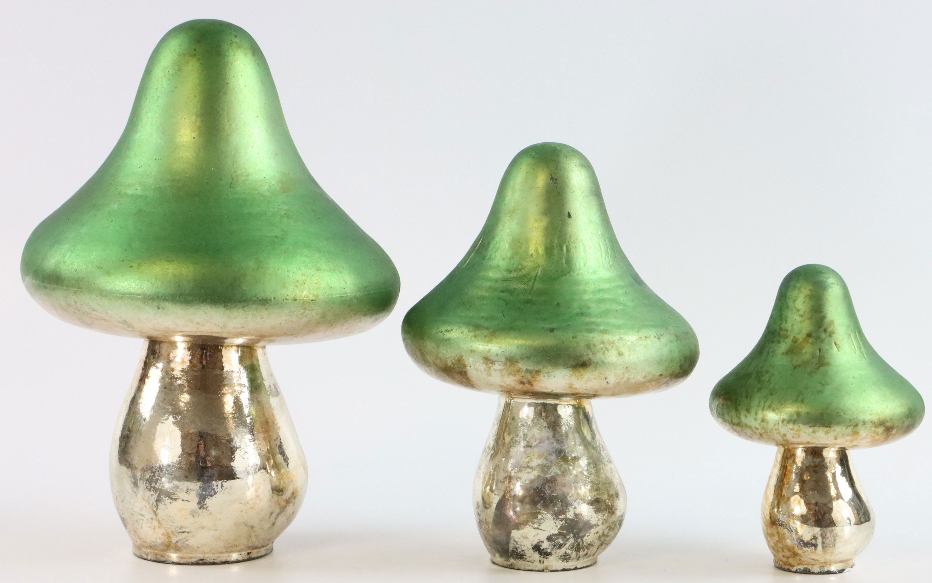 ENImpress your customers with our stylish GLASS MUSHROOMS "VERDE" S/3 - an essential piece for any autumn or winter living environment. This 3-piece set, consisting of handmade glass mushrooms in different sizes (22.5cm, 16.5cm and 13cm), offers a charming way to integrate the nature theme into living spaces and creates a cosy atmosphere in the cold half of the year.