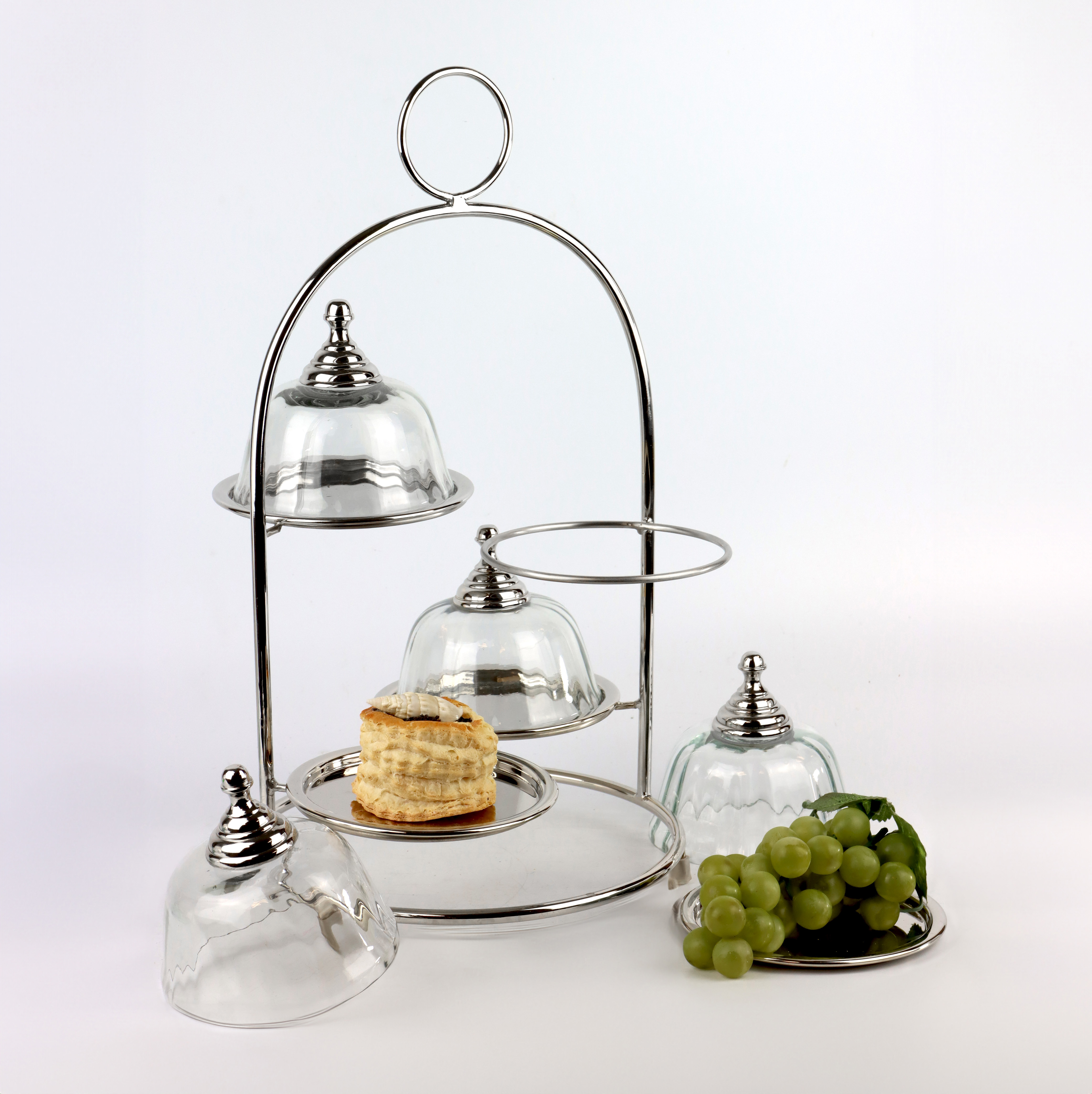 El acabado plateado confiere al conjunto de servicio un aspecto moderno y atemporal que se integra a la perfección en cualquier ambiente. Tanto si lo presenta en un salón decorado con estilo como en un espacioso comedor o una elegante tienda, este conjunto atraerá la atención de todos. Es perfecto para presentar con estilo aperitivos, postres o delicados canapés y ofrece infinitas posibilidades para arreglos creativos.