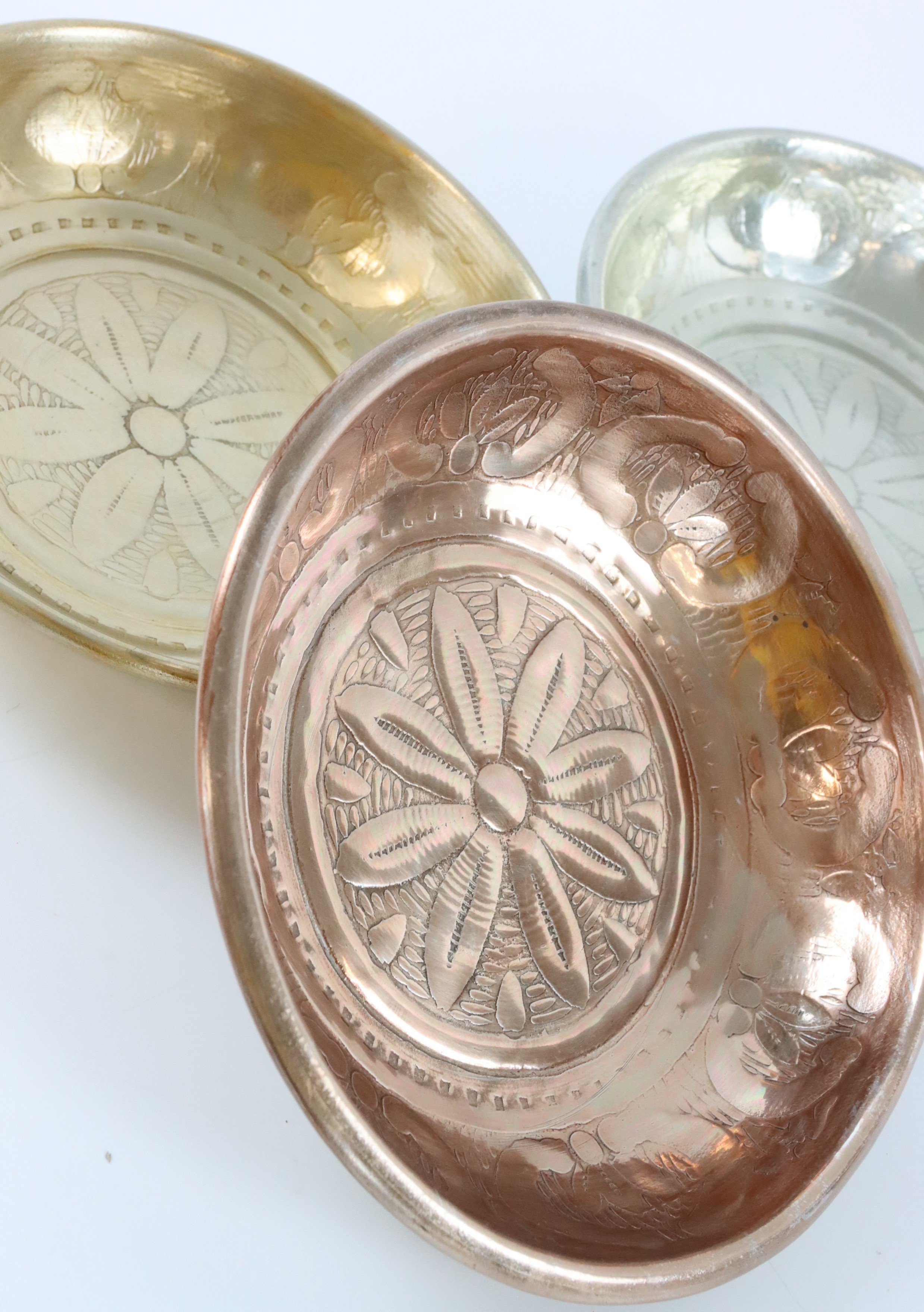 Experimente la elegancia atemporal y la variedad con nuestro juego de cuencos de 3 piezas "MEDINA". Este exquisito juego, compuesto por tres elegantes cuencos en los sofisticados colores oro, plata y bronce, aporta encanto oriental a su tienda y enriquece el ambiente con un toque de exclusividad. Los cuencos "SCHALEN MEDINA" no sólo son funcionales, sino que también atraen todas las miradas en cualquier mesa de presentación amueblada con estilo o en un escaparate decorado.