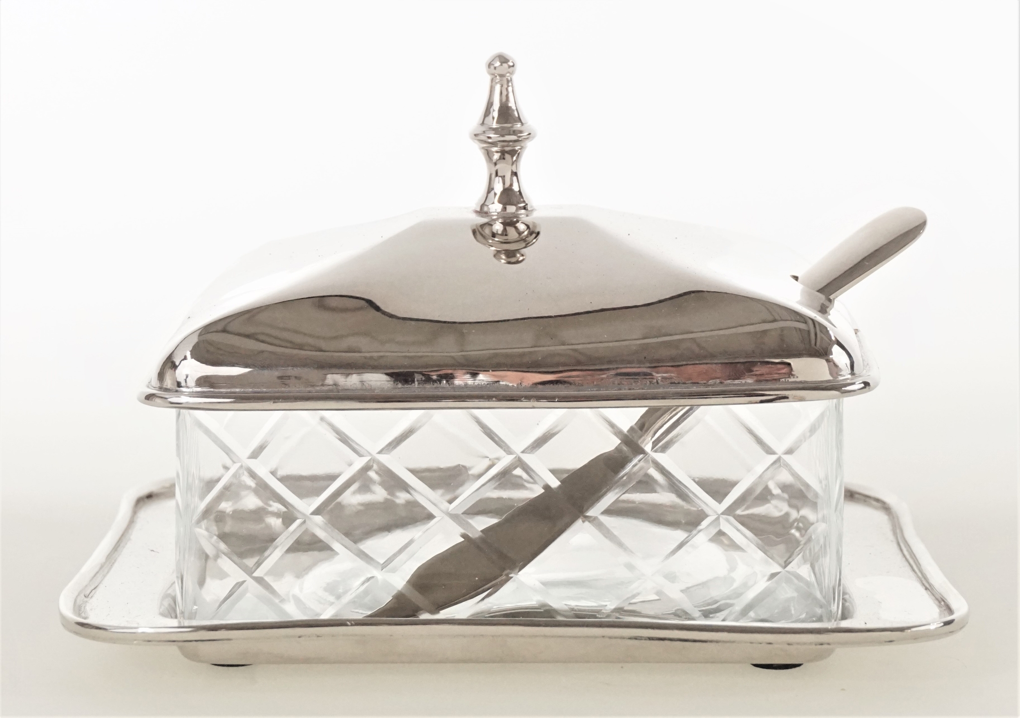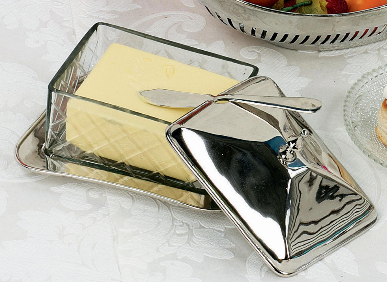 - **Material de alta calidad:** Fabricado con cristal robusto y un elegante cuchillo plateado para mantequilla.