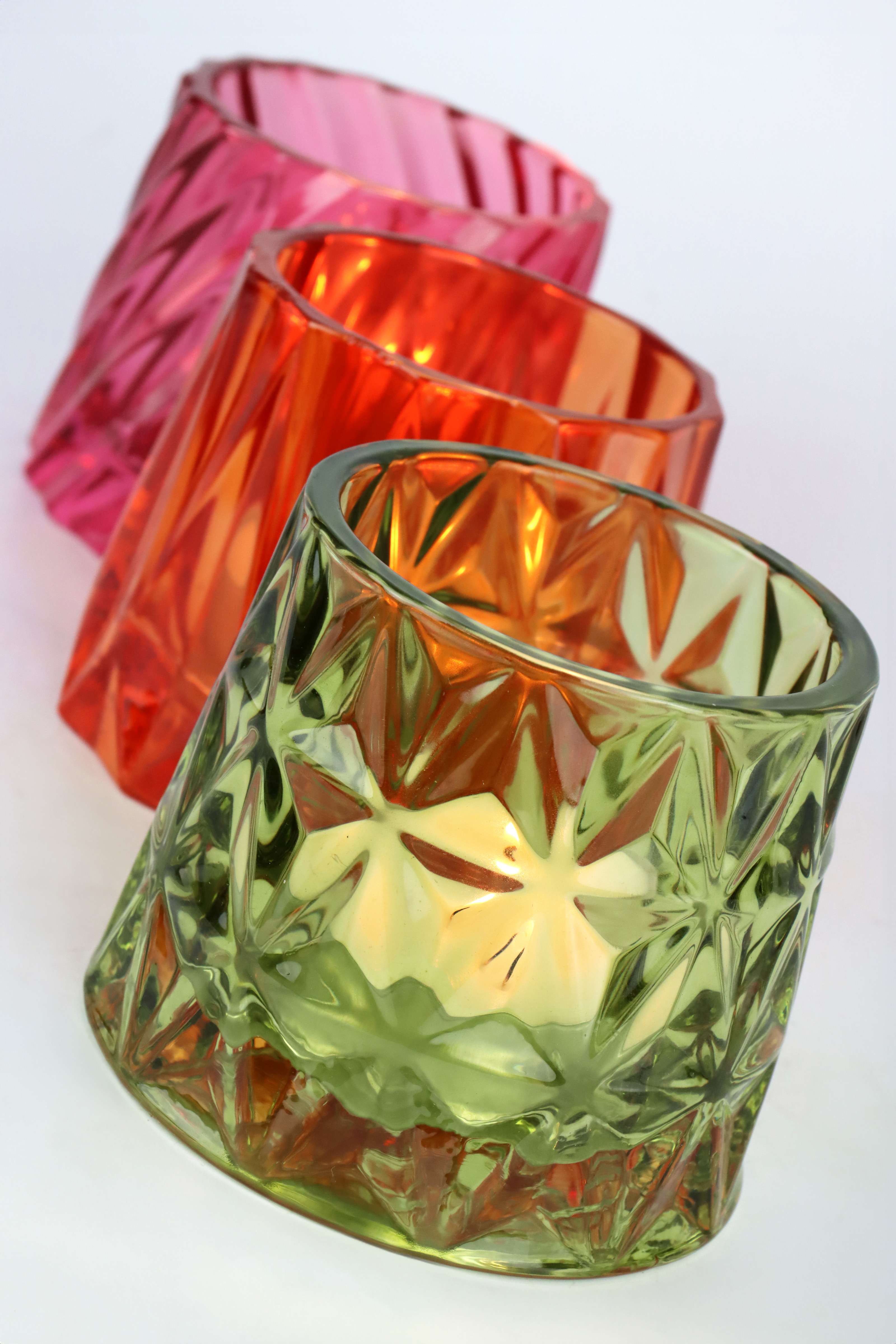 - Juego de tres piezas de cristal de alta calidad en vivos colores
