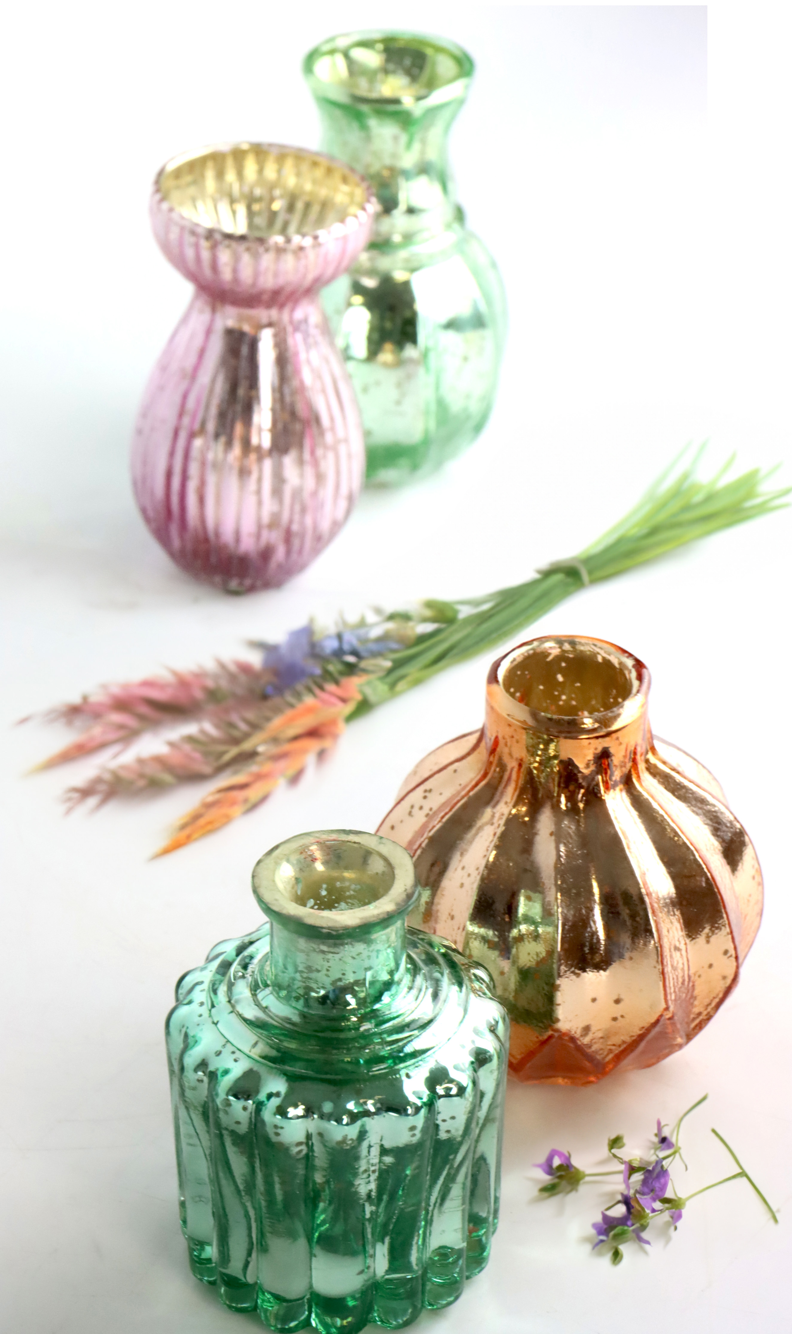- Cuatro elegantes jarrones en colores pastel: rosa, verde, azul y naranja.