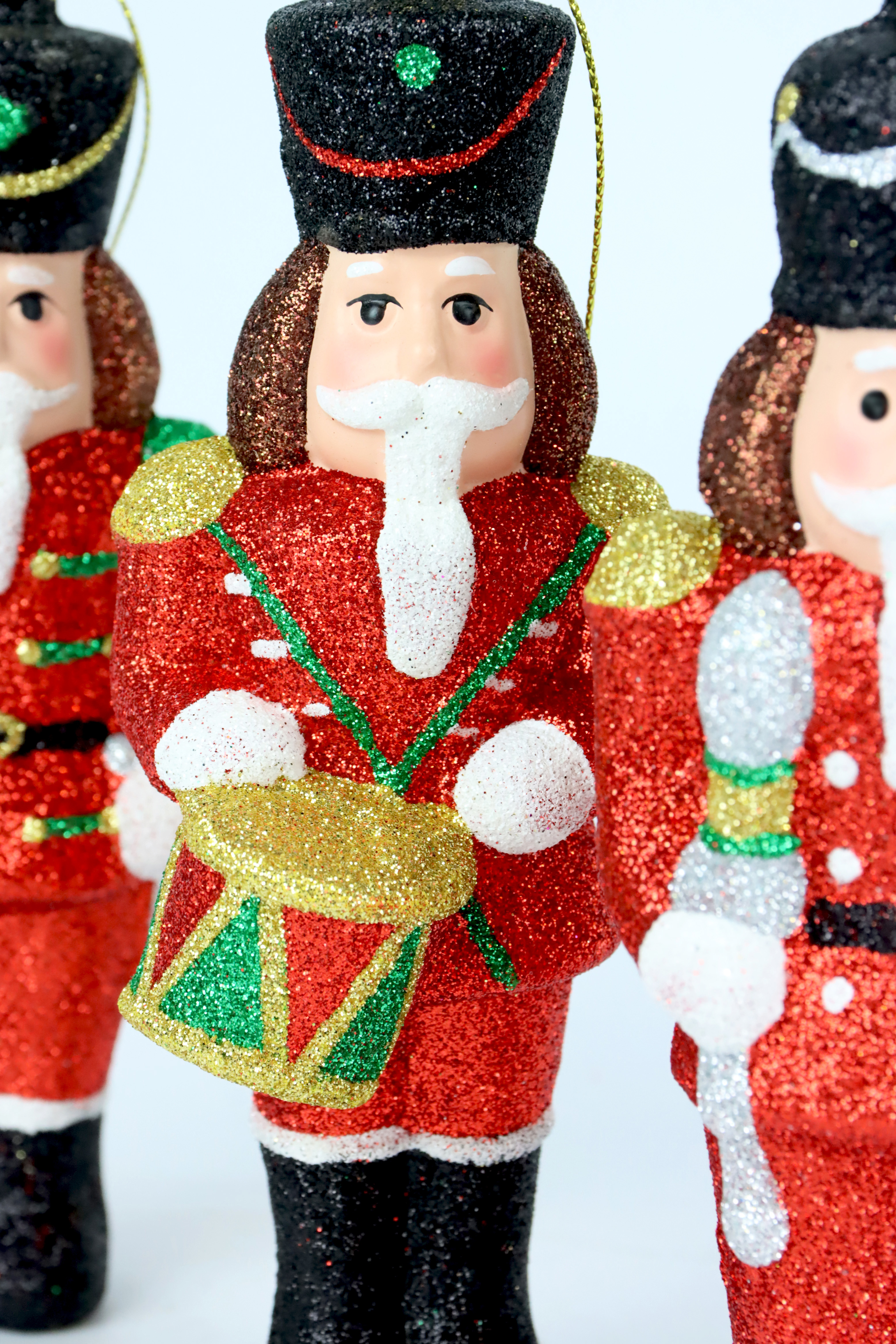 Las vibrantes figuras navideñas de plástico están muy detalladas y decoradas con purpurina brillante que capta toda la luz y realmente realza lo mejor de tus decoraciones navideñas. El set consta de tres soldados diseñados individualmente que se yerguen orgullosos. Cada figura mide aproximadamente 15 cm de alto y es perfecta para colocar en el árbol de Navidad o en un arreglo navideño. Gracias al material de alta calidad, los adornos son duraderos y pueden utilizarse en muchas fiestas navideñas en los años venideros.