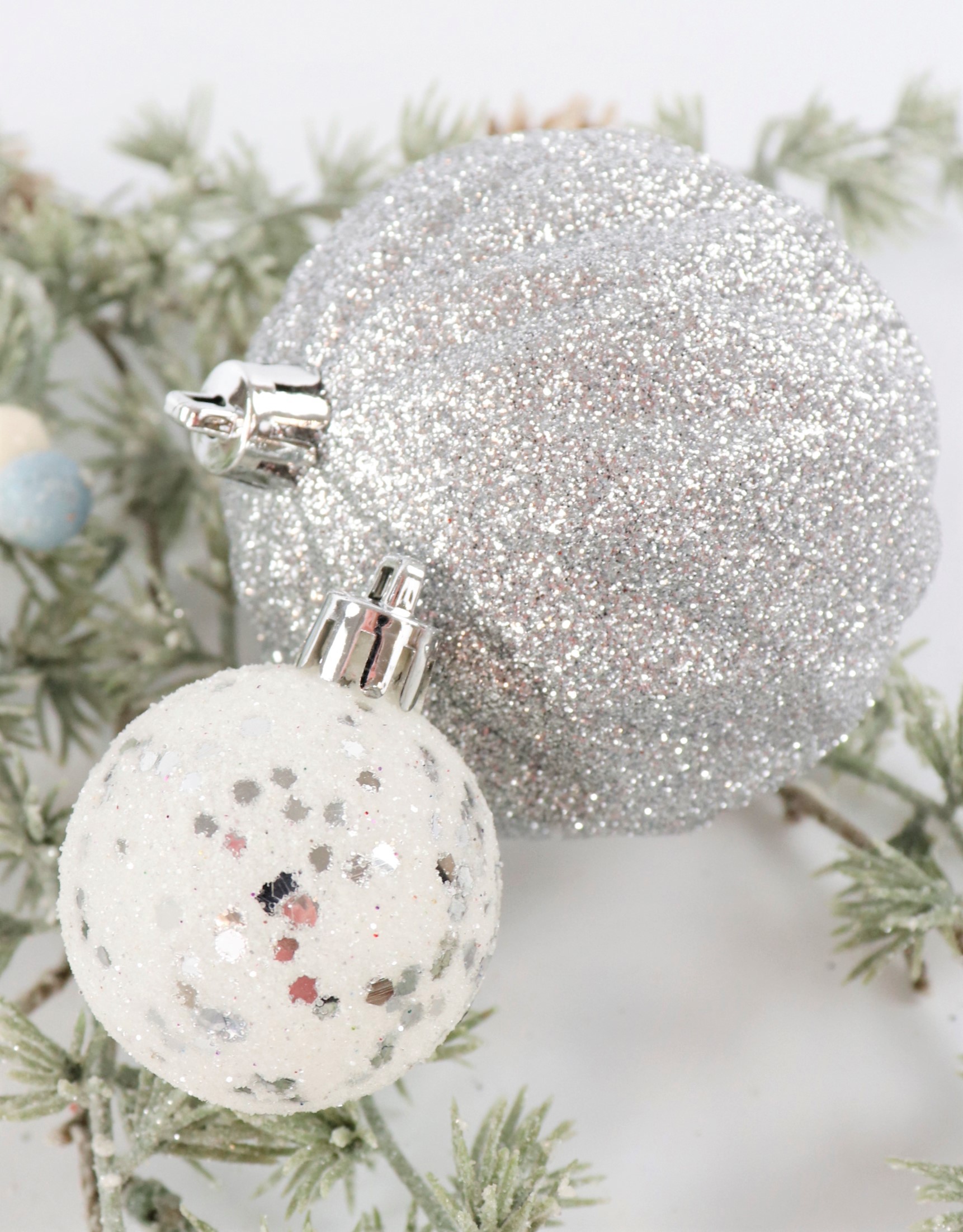 - Elegantes adornos plateados de unos 15 cm de diámetro