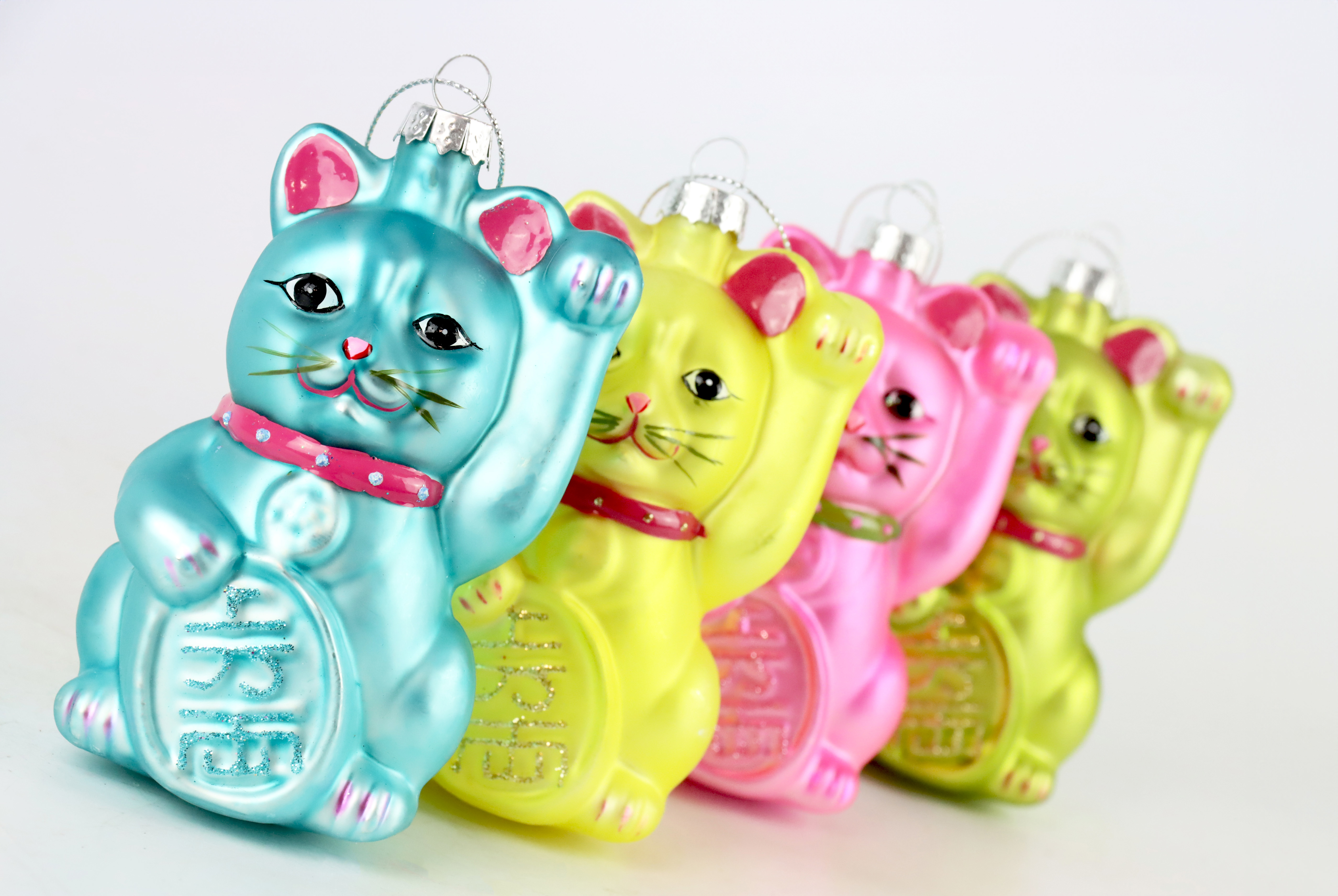 Destaque su gama con nuestro exclusivo juego de bisutería en vidrio "Gato de la suerte" y permita que sus clientes se lleven un trozo de suerte a casa.