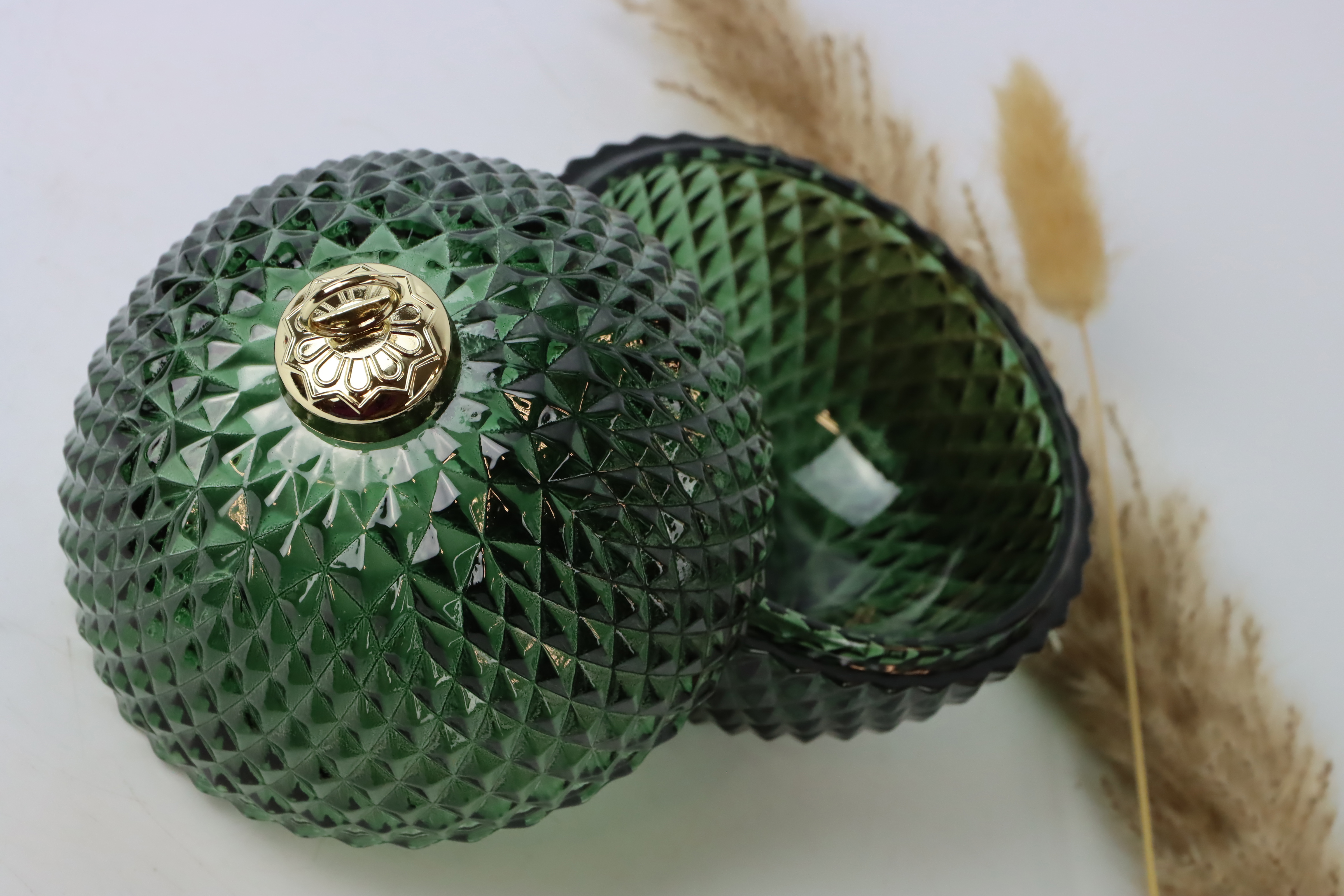 Fabricado en vidrio de alta calidad, este tarro de cristal impresiona por su fina elaboración. El color verde oscuro del vidrio recuerda a los bosques de pinos de un verde intenso y evoca la paz de las noches de invierno. La forma del artículo es ideal para ello, ya que recuerda a los tradicionales adornos para el árbol de Navidad y, por tanto, se adapta perfectamente a cualquier decoración navideña.