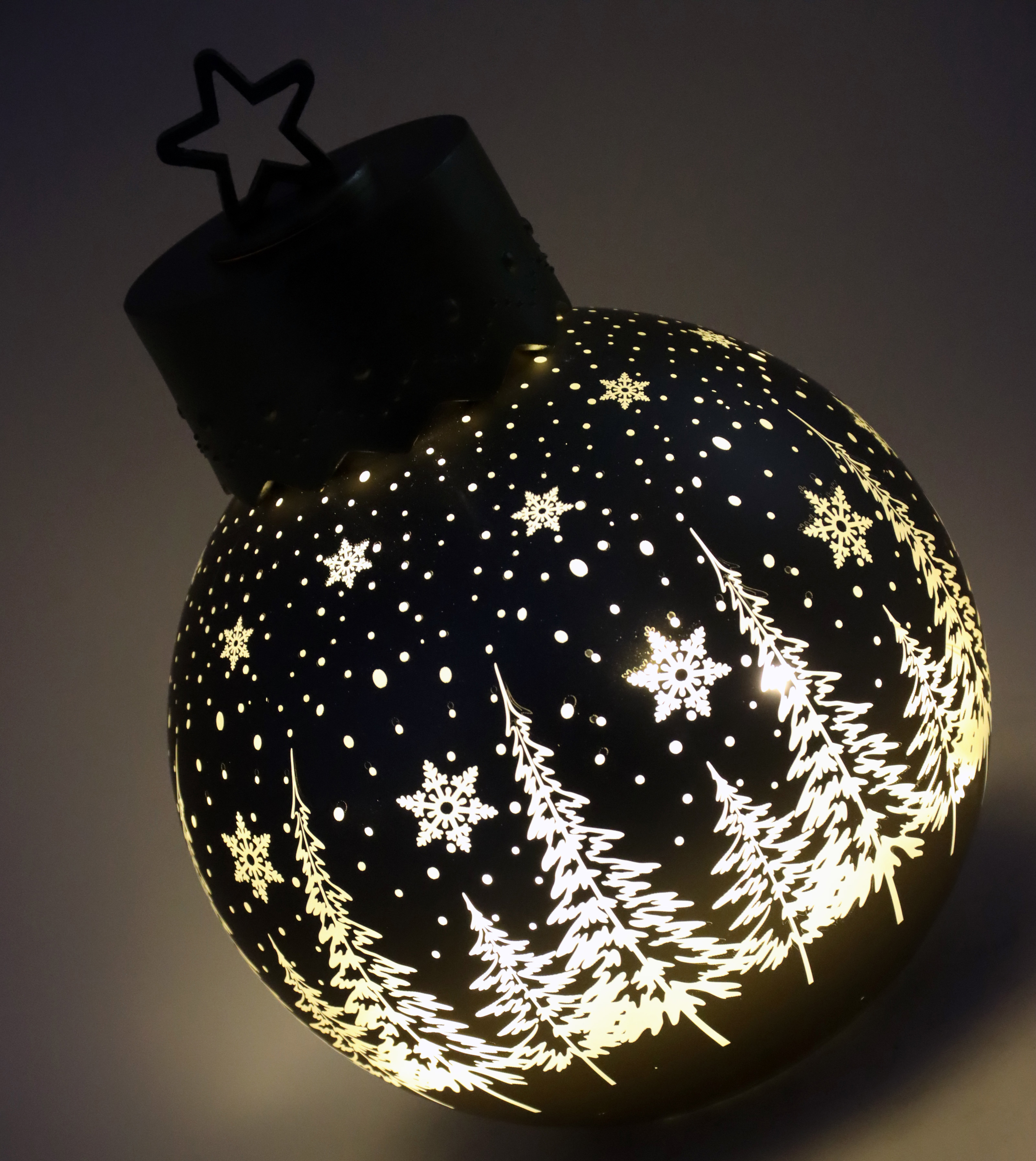 El adorno luminoso LED "WINTERWALD" en un elegante color dorado está fabricado en cristal y plástico de alta calidad y tiene un diámetro de unos 25 cm. Esta combinación de materiales no sólo confiere a la esfera un aspecto sofisticado, sino que también garantiza una larga vida útil y robustez. El elaborado diseño del interior de la esfera recuerda a un bosque invernal cubierto de nieve, que queda impresionantemente realzado por la suave luz LED.