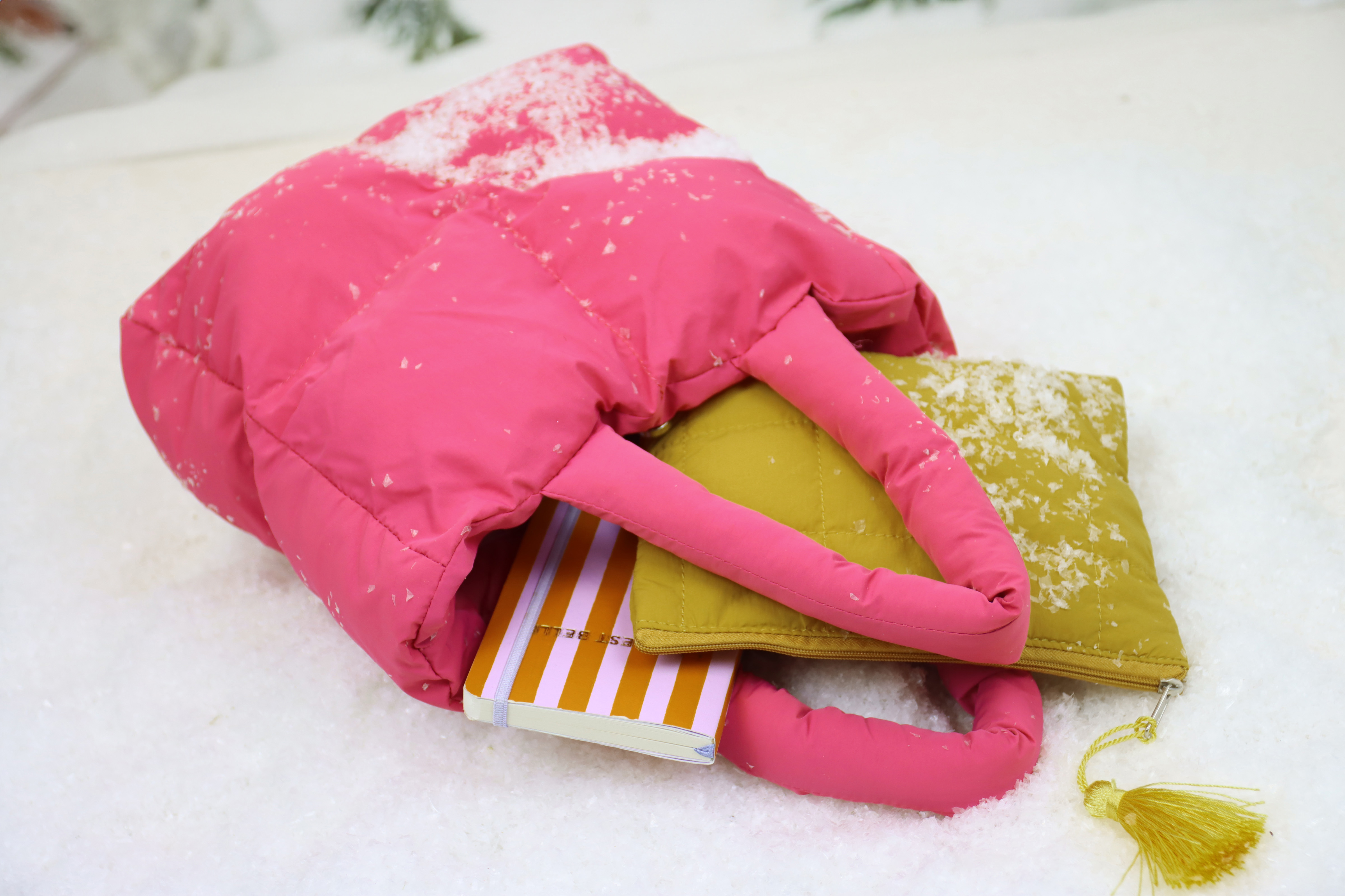 - Juego de bolsas de tres piezas en colores vivos: rosa, verde y amarillo.