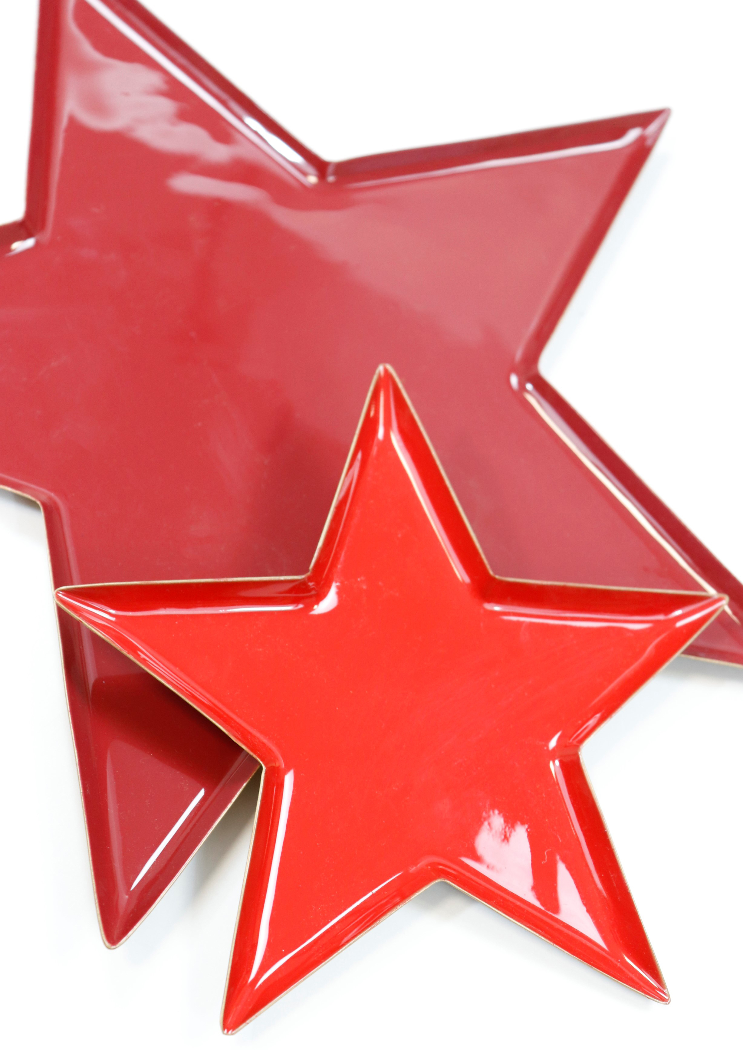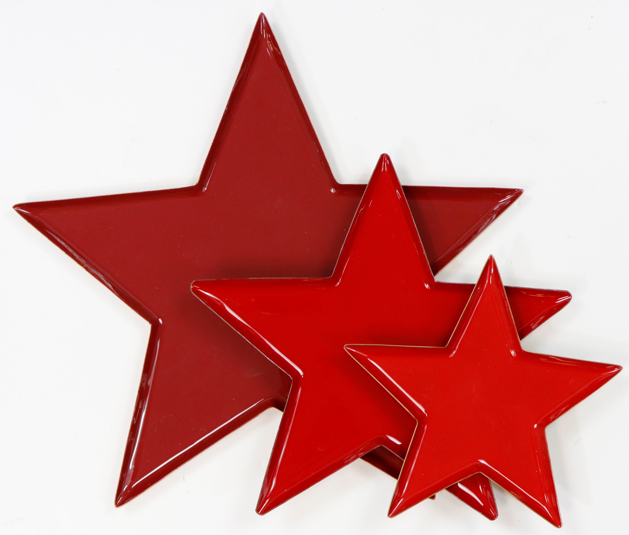 - Un juego de tres bandejas de estrella en diseño rojo, en tamaños de 20, 28 y 38 cm