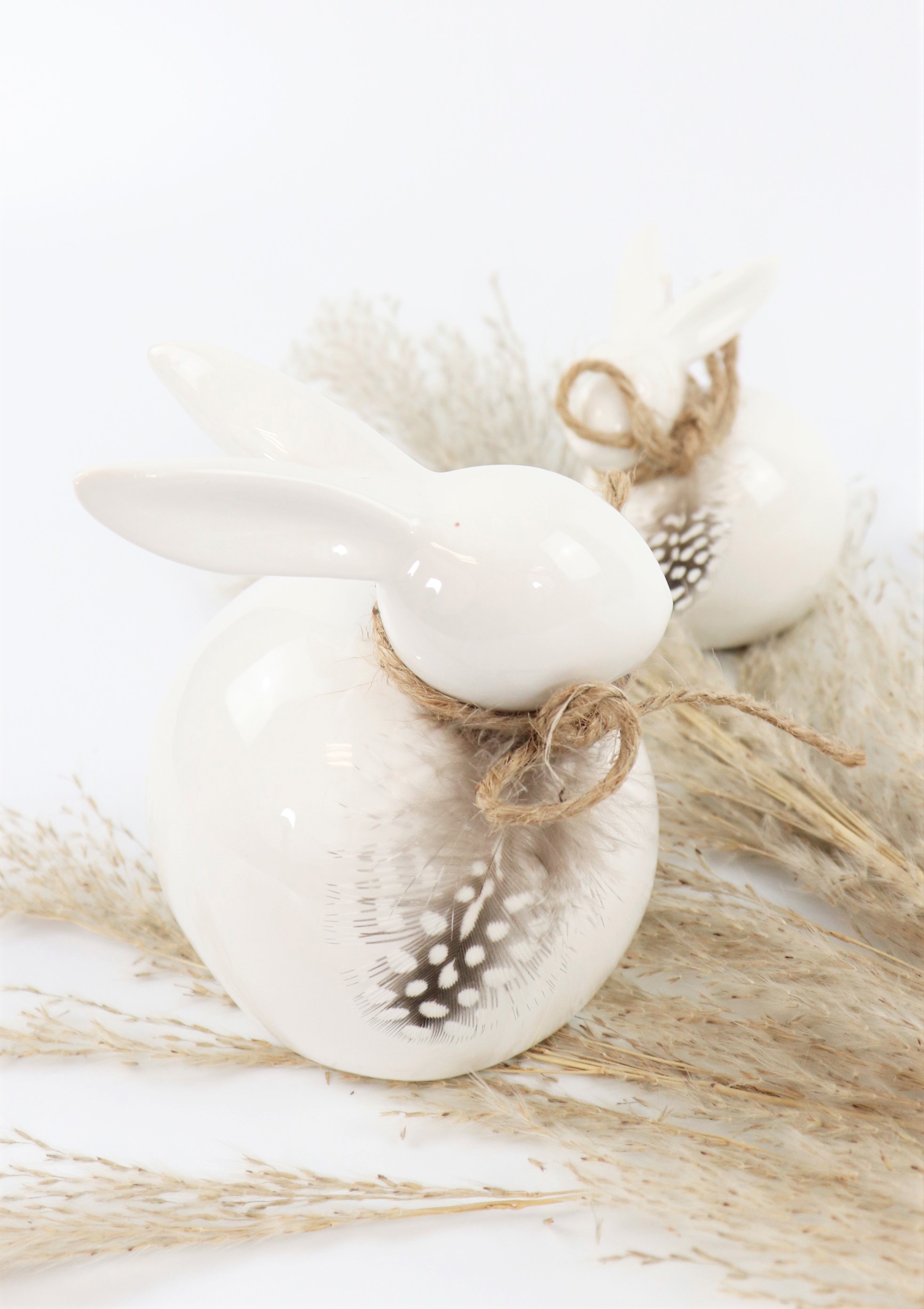 El trío de conejos "FEATHERS" S/3 es un elemento decorativo destacado para la primavera. Las tres figuras de conejo de aprox. 14 cm, 11 cm y 7,5 cm aportarán un soplo de aire fresco a sus ideas decorativas. Cada figura está fabricada en porcelana fina y decorada con todo lujo de detalles, especialmente las delicadas plumas, que añaden encanto a esta encantadora decoración de Pascua. Tanto si presenta las figuritas como centro de mesa de Pascua o como sutil reclamo en un escaparate, seguro que atraen la atención de sus clientes.