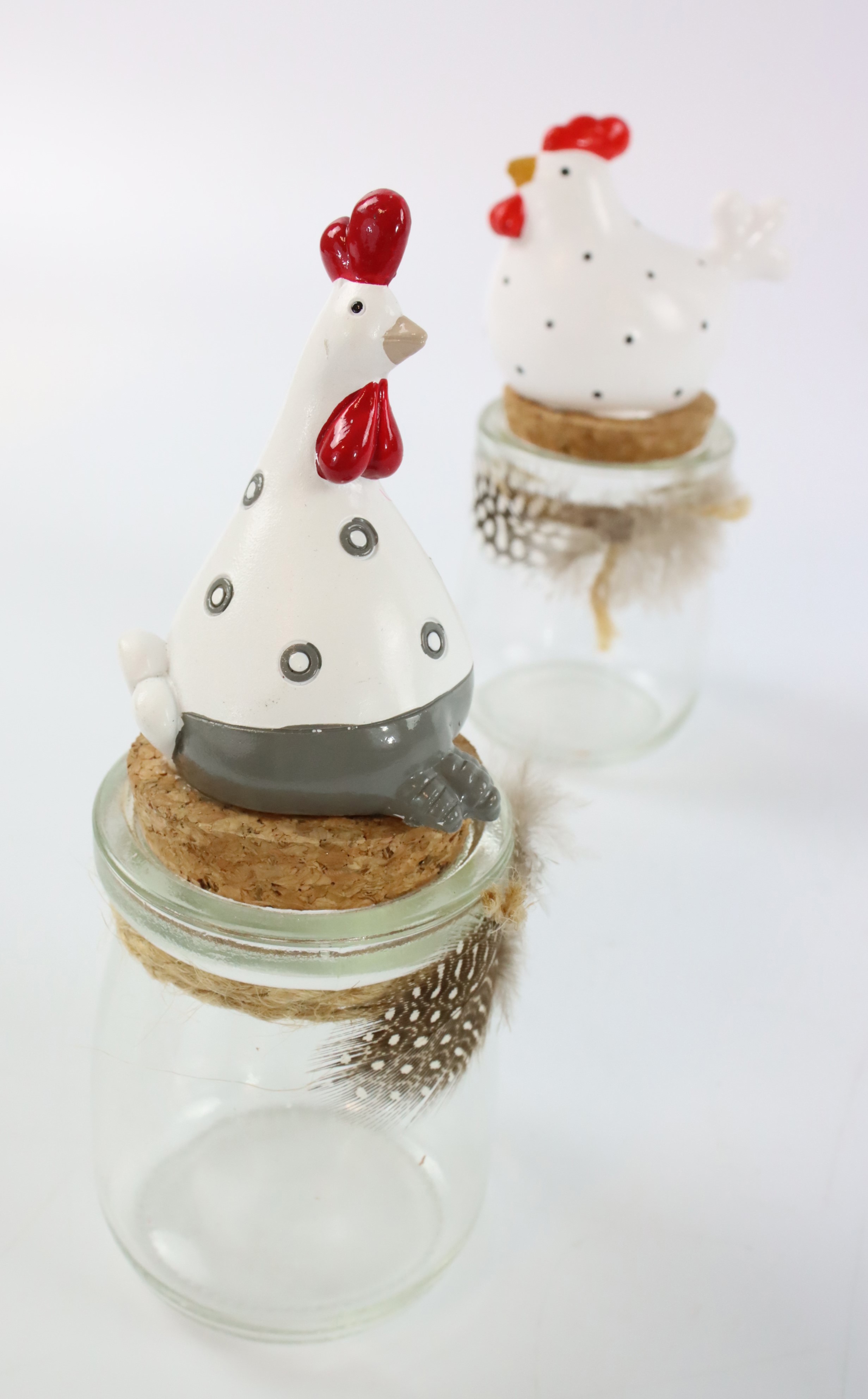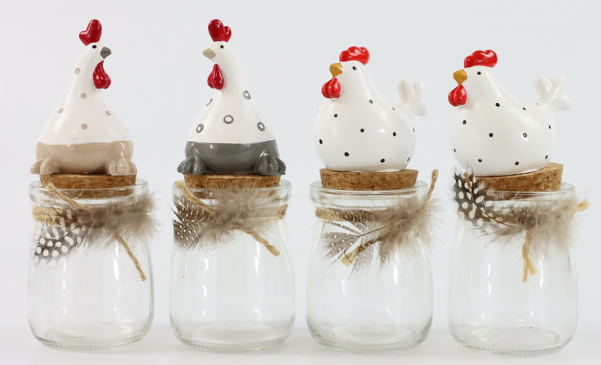 - Set compuesto por cuatro tarros de cristal con gallina blanca decorativa