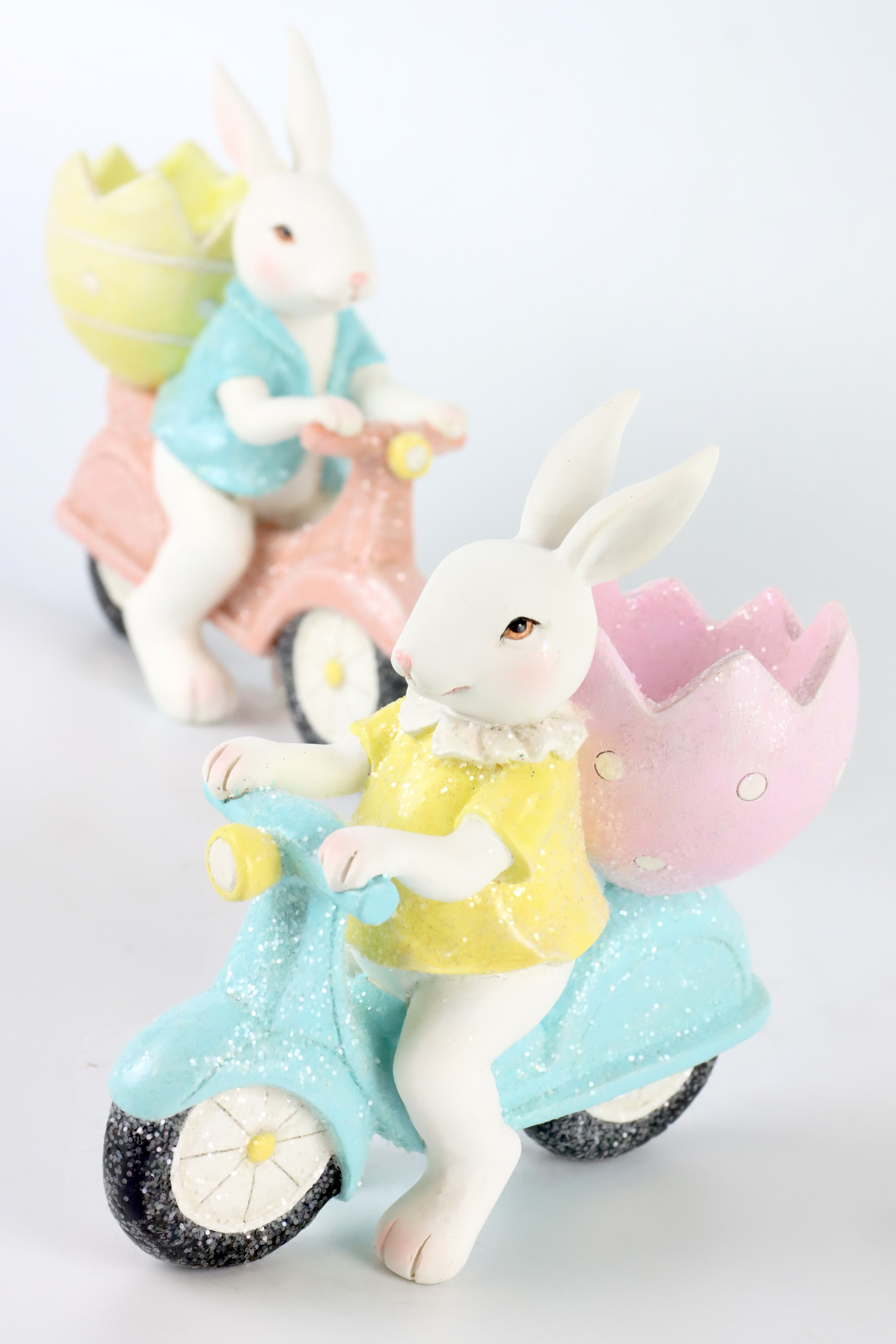 Dado que la demanda de decoraciones individuales y temáticas no deja de crecer, especialmente en Semana Santa, este set es un magnífico complemento para su surtido. Sus clientes apreciarán los atributos creativos y encantadores de estas figuritas de conejo mientras recorren la estación primaveral en patinete. Estas piezas vibrantes y distintivas son especialmente atractivas para los compradores que buscan elementos decorativos únicos para realzar sus hogares.