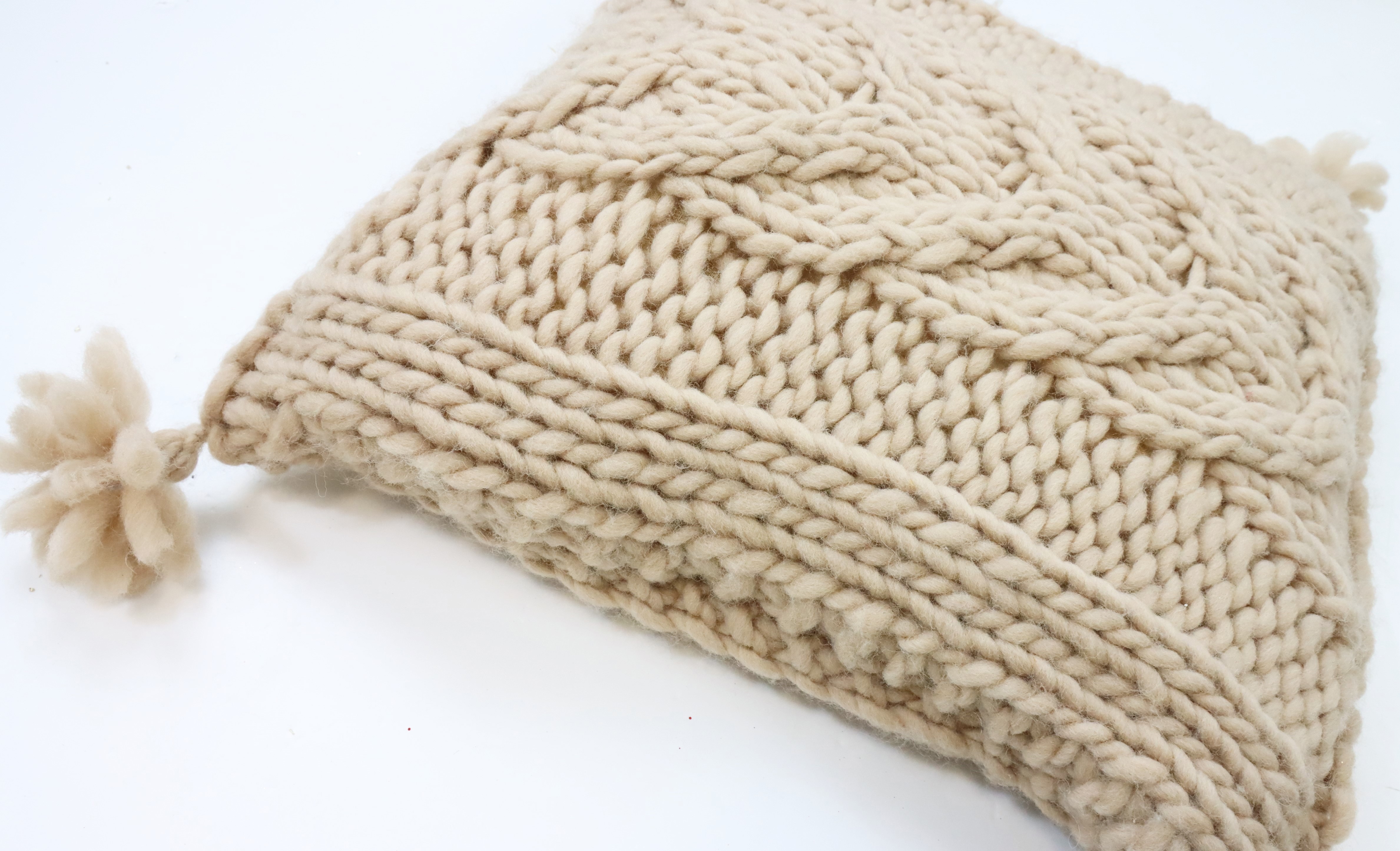 Mots-clés : housse de coussin en tricot, housse de coussin, accessoire d'intérieur automne/hiver, style rustique, produits lifestyle, housse de coussin en tricot, housse de coussin en coton, décor de salon, design d'intérieur, style chalet, housse de coussin 45x45, housse de coussin caramel.