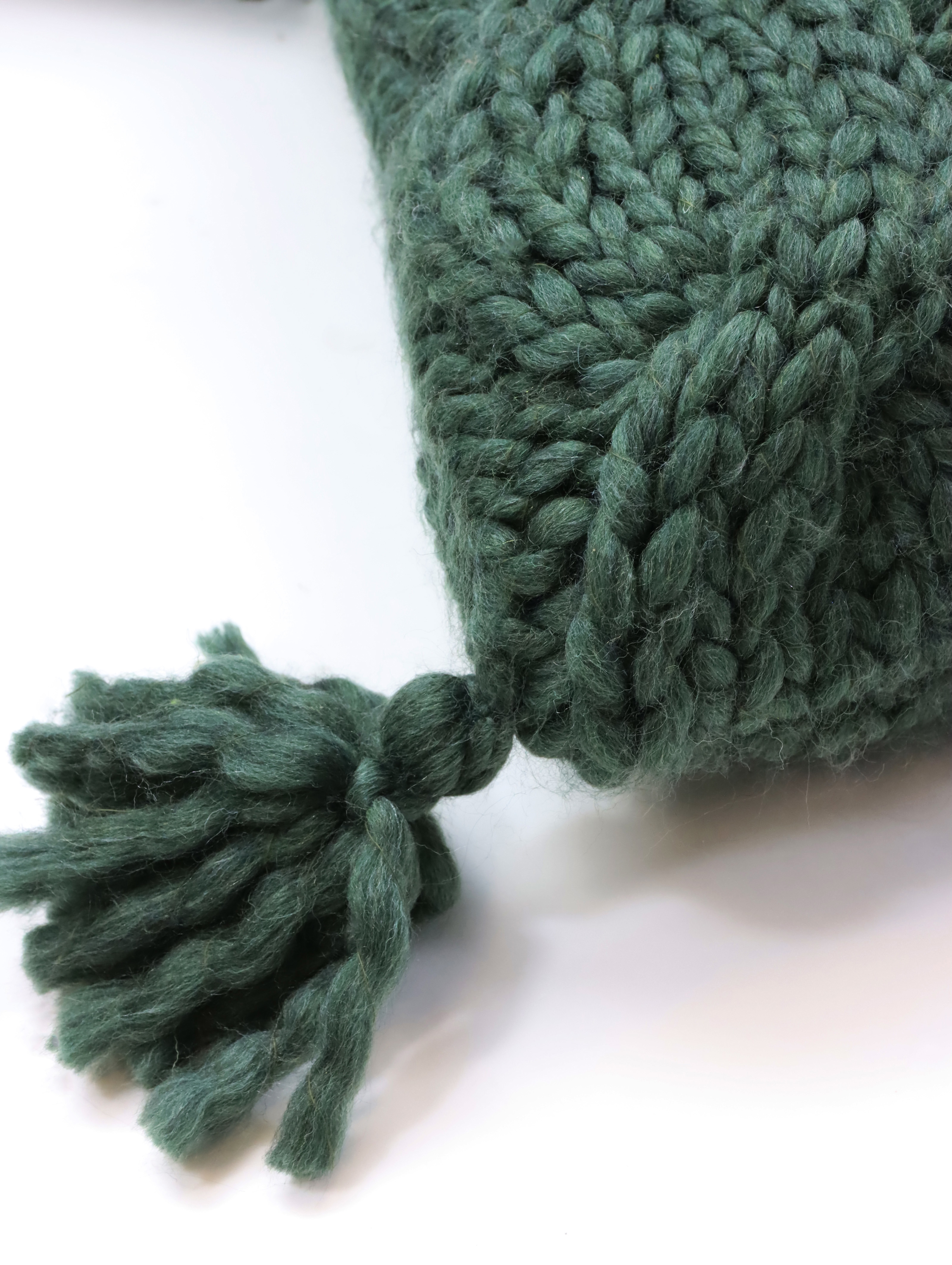 Mots-clés : housse de coussin, COUSSIN Tricoté GSTAAD, accessoire d'intérieur, conception de produit durable, coussin vert foncé, collection automne/hiver, bouteilles PET recyclées, habitat et style de vie, produit écologique, aménagement durable.