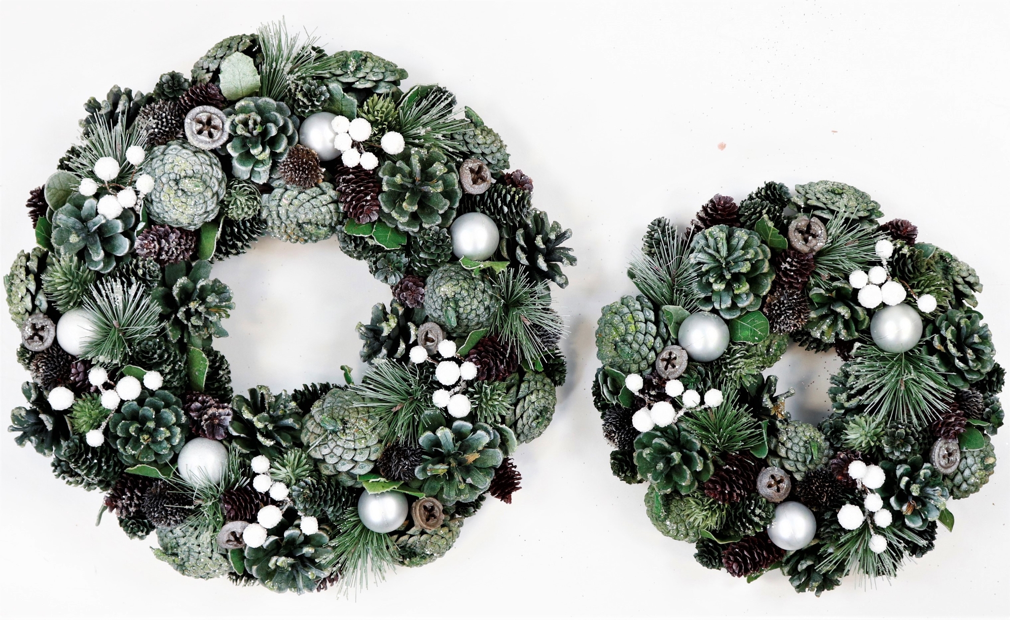 La référence 6684 présente, avec ses COURONNES "SILVRETTA" S/2, un ensemble exquis de deux couronnes de Noël stylées. Fabriquées en bois de qualité supérieure et discrètement décorées de pommes de pin et de fleurs séchées, ces pièces de décoration saisonnières dégagent une atmosphère à la fois naturelle et festive. La fine touche de vert du polystyrène s'harmonise parfaitement avec les éléments en bois et complète ainsi tout environnement d'aménagement, d'habitat et de style de vie.